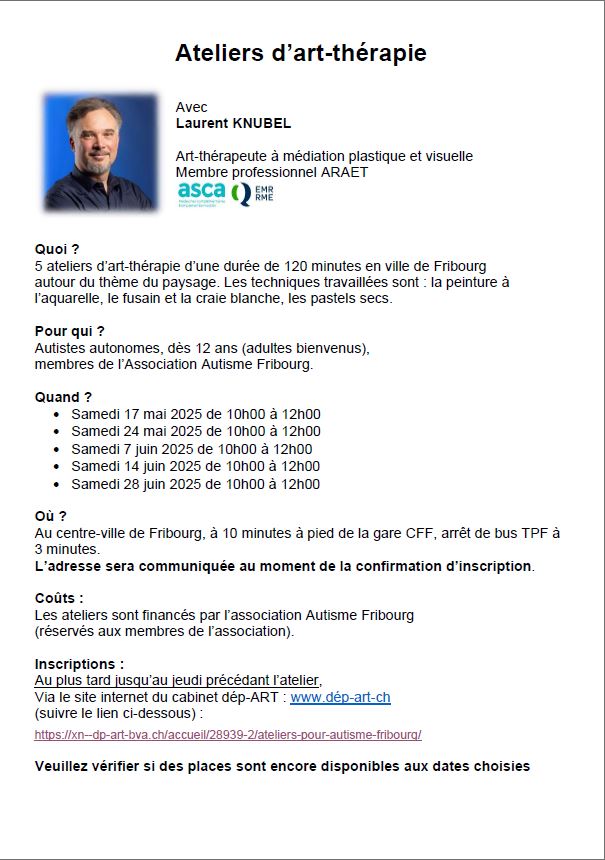… ateliers d’art-thérapie d’une durée de 120 minutes en Ville de Fribourg autour du thème du paysage. Les techniques travaillées sont: la peinture à l’aquarelle, le fusain et la craie blanche, les pastels secs.