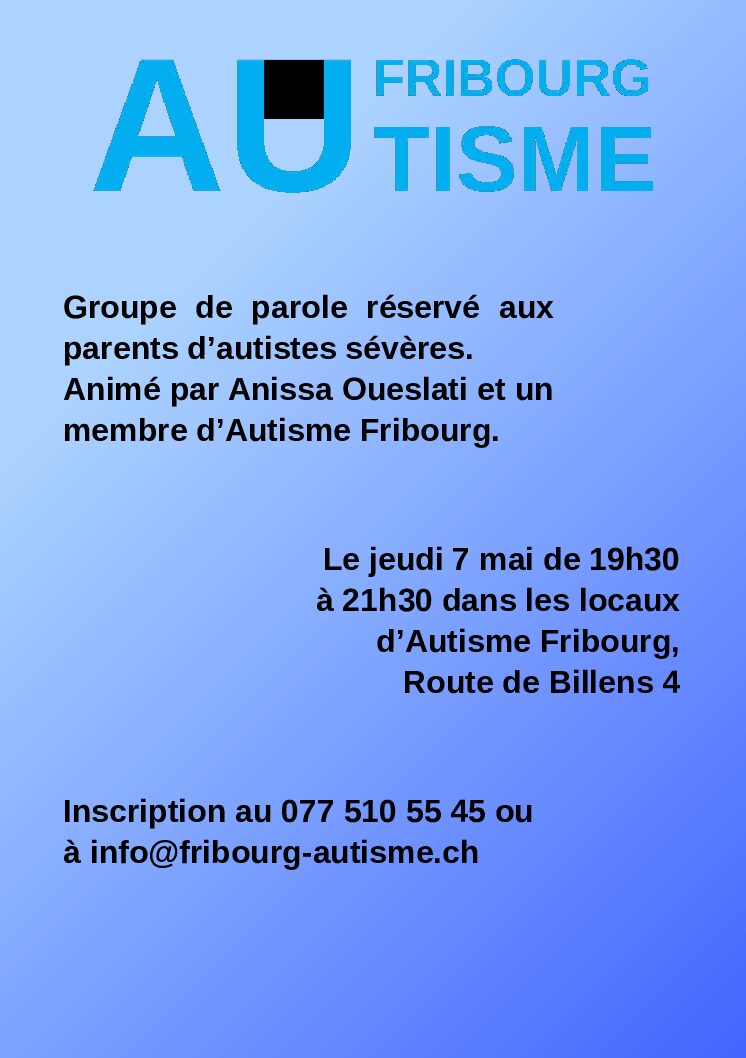 actu gallerie google drive Non classé Date Mai 07 2026 Heure 19h30 - 21h30 Groupe de parole réservé aux parents d’autistes sévères Partagez cet événement